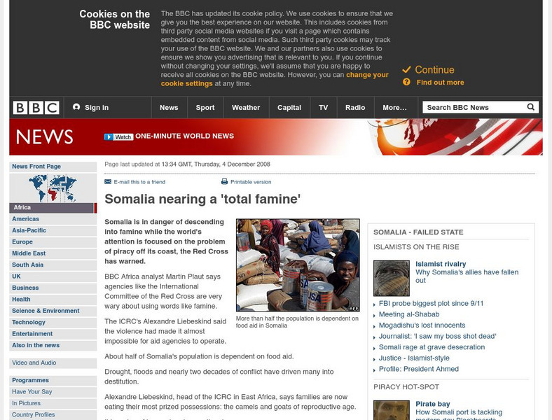 A brief account of Somalia's devastating direction toward famine. The country's people are starving yet humanitarian aid is not reaching them because of the Somali pirates hijacking ships in the region. (December 4, 2008)