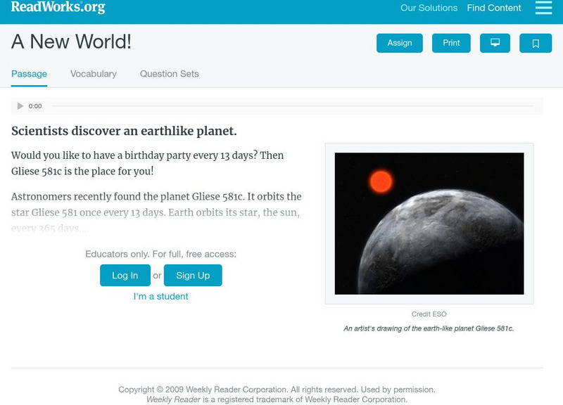 [Free Registration/Login Required] This informational text passage describes the exoplanet named Gliese 581c in the solar system. This passage is a stand-alone curricular piece that reinforces essential reading skills and strategies and...