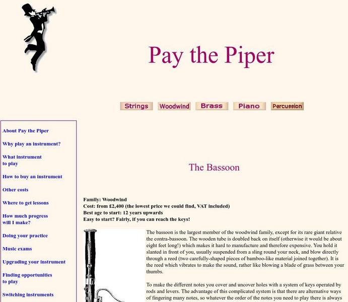 Learn about the Bassoon, "the largest member of the woodwind family," at this website. The site is geared toward young students who are thinking about playing a musical instrument.