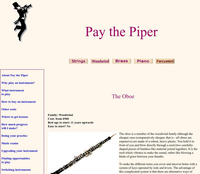 This website, geared toward young students who are thinking about playing a musical instrument, provides the "pros and cons" of playing the oboe. The site provides background information about this woodwind and related links as well.