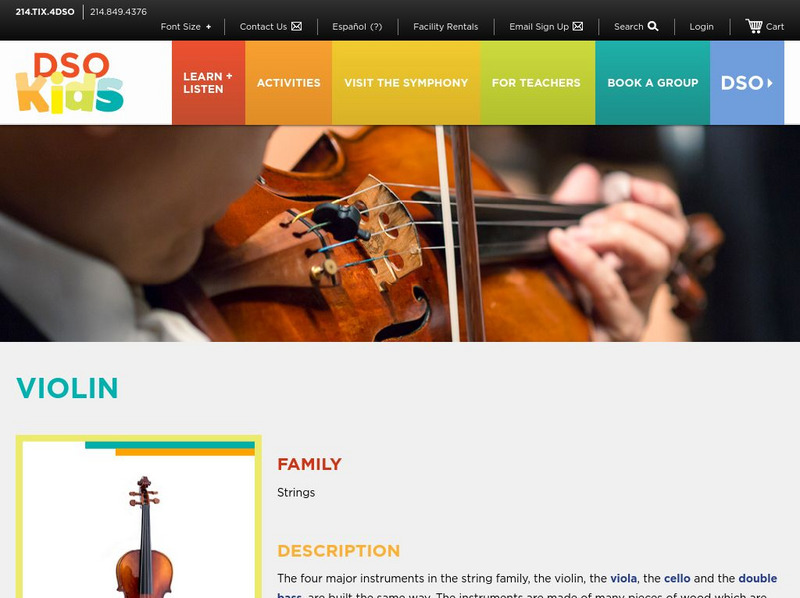 Read about the violin, as well as a few other string instruments. Use Windows Media Player or Real Audio to listen to three violin samples. Pictures of the instrument are also provided.