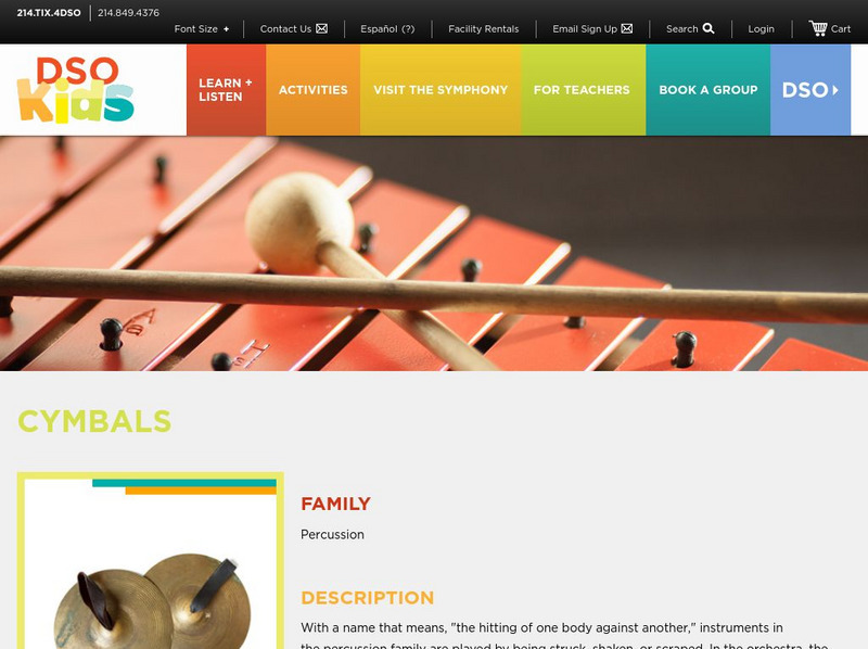 Learn about the ways to play the cymbals and how they contribute to the sound of the orchestra. Use RealAudio to listen to cymbals alone and with the orchestra. Pictures of the instrument are also provided.
