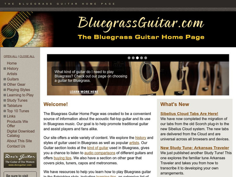 Source of information about the acoustic flat-top guitar and the playing styles used in bluegrass music. Recommendations for instructional materials to learn to play; history of Doc Watson, discussion areas, links.