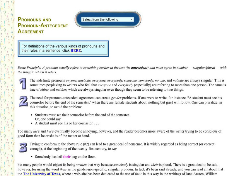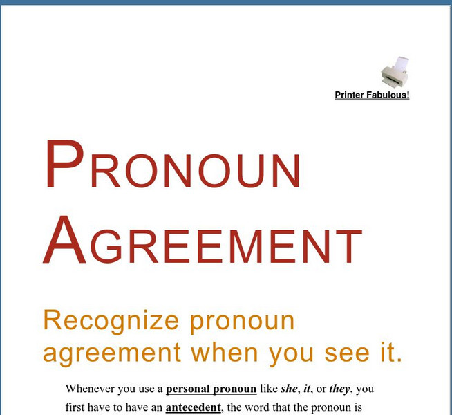 This tutorial-quiz for pronoun usage features many examples of where pronouns fit in a sentence to achieve proper antecedent agreement.