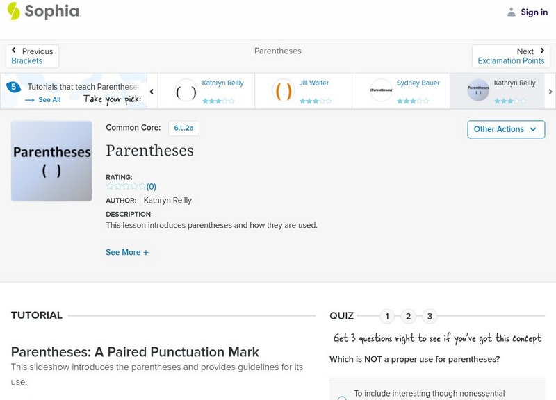 This lesson introduces parentheses and how they are used. This tutorial lesson shares a short slideshow and provides review questions over the lesson's content.