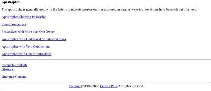 This site discusses the correct and incorrect usage of apostrophes to show possession and examples are provided. Note that links are provided at the bottom of the page for other specific uses of the apostrophe.