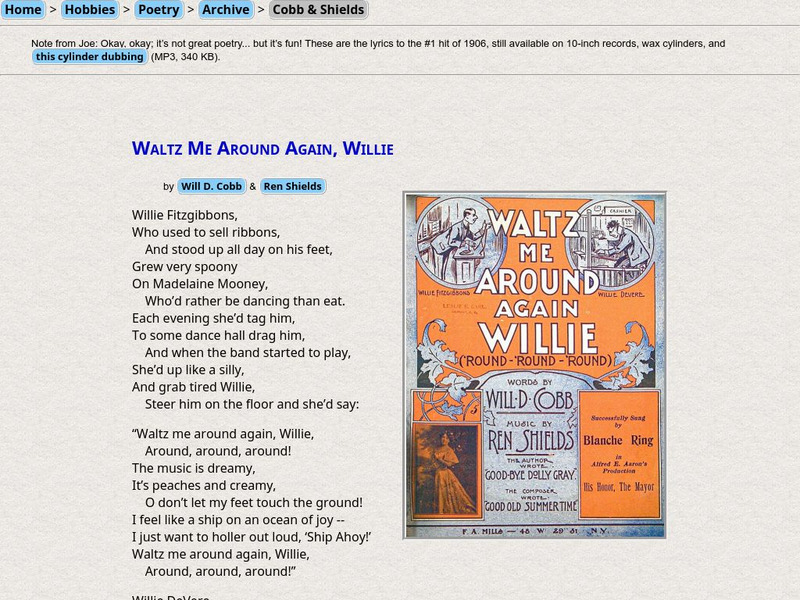 This page provides the lyrics to the 1906, Will D. Cobb and Ren Shields song, "Waltz Me Around Again, Willie."