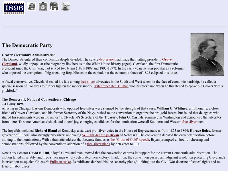 From the very extensive website that covers the presidential campaign of 1896 through political cartoons and contemporary commentary is this discussion about the Democratic Party and its candidates and platform in the election of 1896....