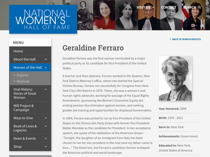 Read about the life of the first woman to be nominated by a major political party for the candidacy of Vice President of the United States. Inducted into the Woman's Hall of Fame in 1994.