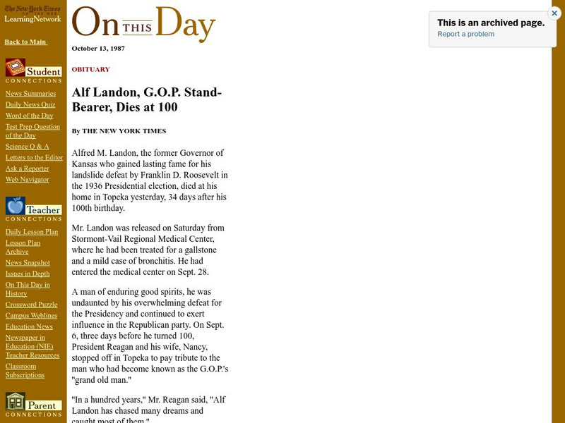 New York Times: On This Day: Alf Landon, g.o.p. Stand Bearer, Dies at 100