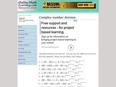 In this online math learning exercise, students practice complex number division using positive and negative integers. When complete, students submit their answers and get instant feedback regarding their accuracy.