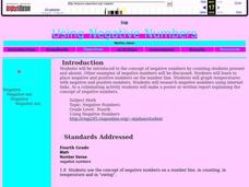 Fourth graders explore negative numbers with this resource. They discuss positive and negative numbers by counting who is present and absent, placing numbers on a number line, and graphing temperatures. Using a variety of activities,...