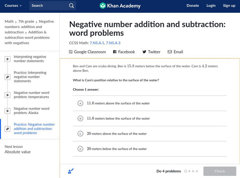 Practice solving word problems with negative numbers. Students receive immediate feedback and have the opportunity to try questions repeatedly, watch a video or receive hints.