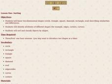 Students identify attributes of different geometric shapes. In this geometry lesson plan, students view a PowerPoint presentation on shapes and use attribute blocks to examine the corners and edges of each shape. Students work...
