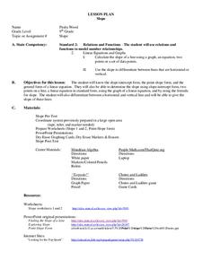 Students calculate the slope of a line. In this slope lesson, students use a graph, an equation or two points to help them calculate the slope of a line. They differentiate between a slope of zero and an undefined slope.