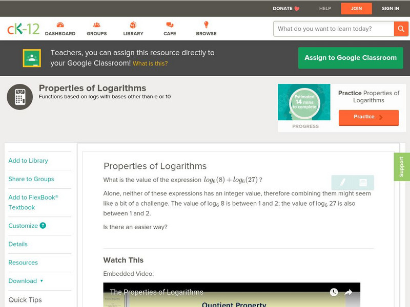[Free Registration/Login may be required to access all resource tools.] In this lesson students use properties of logarithms to rewrite and expand/condense. Students examine guided notes, review guided practice, watch instructional...