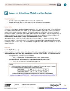 Practice using linear models to answer a question of interest. The 12th installment of a 16-part module combines many of the skills from previous lessons. It has scholars draw scatter plots and trend lines, develop linear models, and...