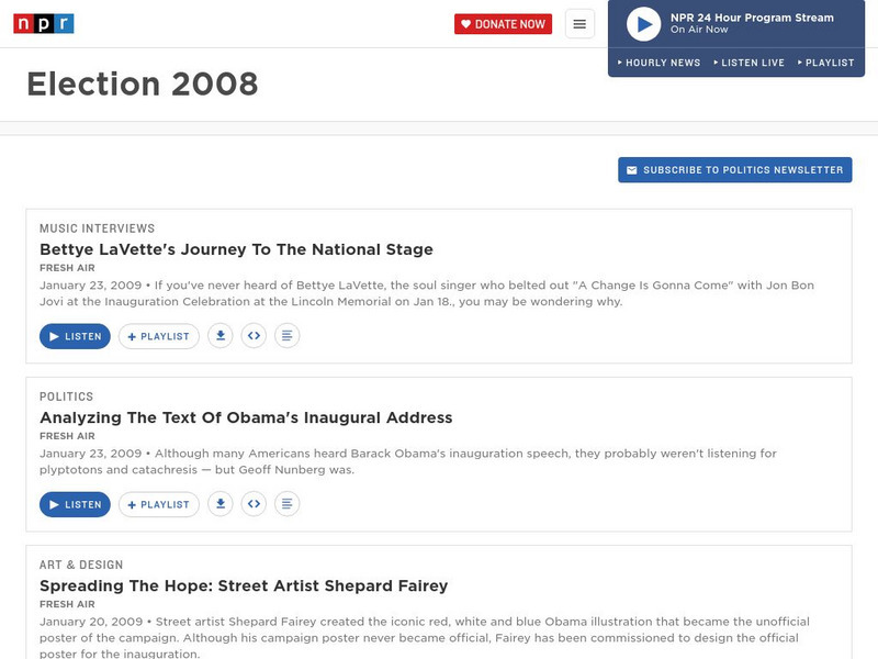 NPR's page on Election 2008 includes various stories on the political candidates, the election and an interactive map of primaries and caucuses as well as follow-up reports.