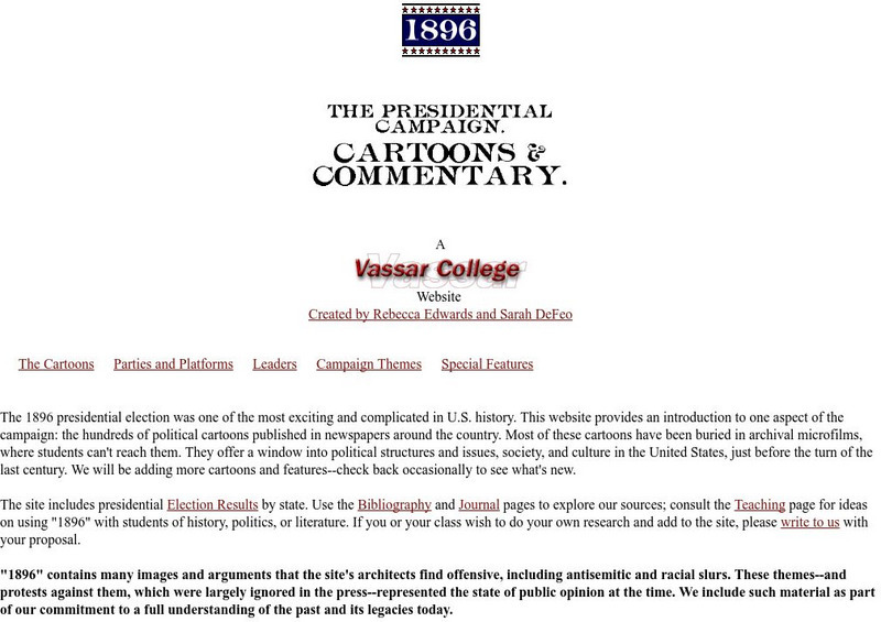 This extensive site from the Vassar College on the 1896 presidential election includes links to cartoons, parties and platforms, leaders, campaign themes, and special features.