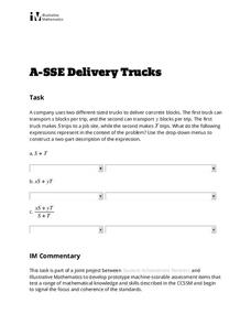 Written to assess students' knowledge of interpreting expressions that represent a quantity in terms of its context, this machine-scored task also allows for a good discussion about units guiding the problem solving and solution.