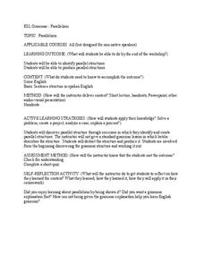 Students use writing to show their understanding of parallel writing structures. In this ESL grammar lesson, students view PowerPoints, listen to short lectures and audio presentations. Students categorize phrases, write stories...