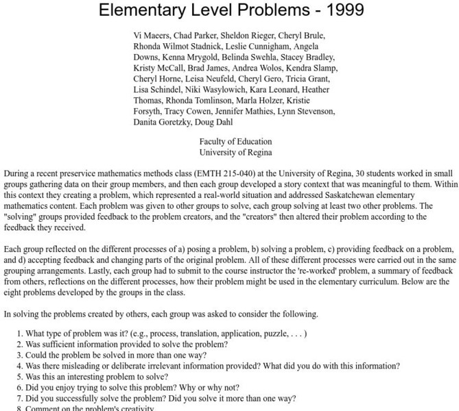 University of Regina: Math Central: Elementary Level Problems 1999