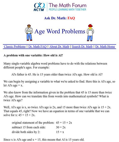 Dr. Math walks you through the necessary steps to solve age problems. Additional examples are included.