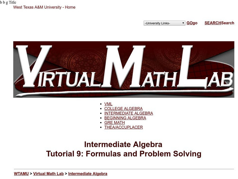 Wtamu Virtual Math Lab: Intermediate Algebra: Formulas and Problem Solving