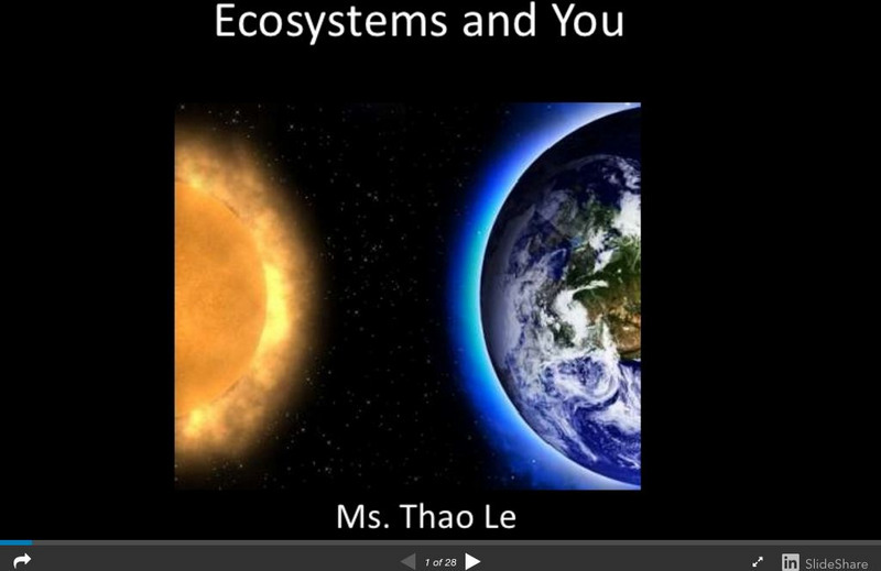 Slideshow that looks at energy flow in an ecosystem. Explains what an ecosystem is, how energy flows through it, the producers and consumers of energy, and food chains. Links to a video about plastic debris in the ocean.