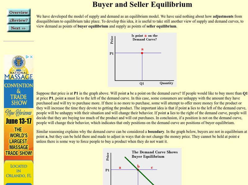 Summarizes buyer equilibrium. Then click Next button at the bottom to learn about seller equilibrium as well as shortages & surpluses.