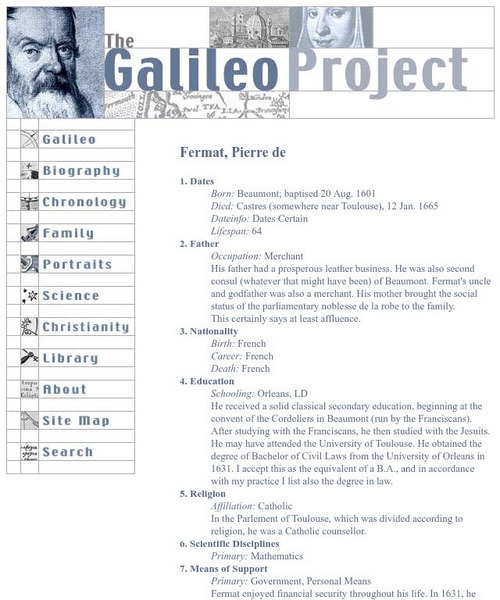 This site from The Galileo Project of Rice University provides information on ten fields of biographical data which are compiled regarding Pierre Fermat, including dates (birth/death), father (occupation/wealth), nationality, education,...
