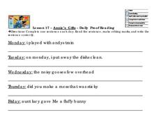 In this daily proofreading worksheet, students correct the sentences on their grammar and punctuation from the story Annie's Gifts. Students correct 5 sentences total.