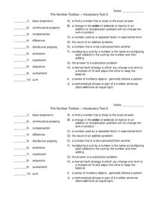 For this numbers vocabulary worksheet, students complete a 10 question test, matching "number" vocabulary terms with their correct definition. Answers are provided on page 2.