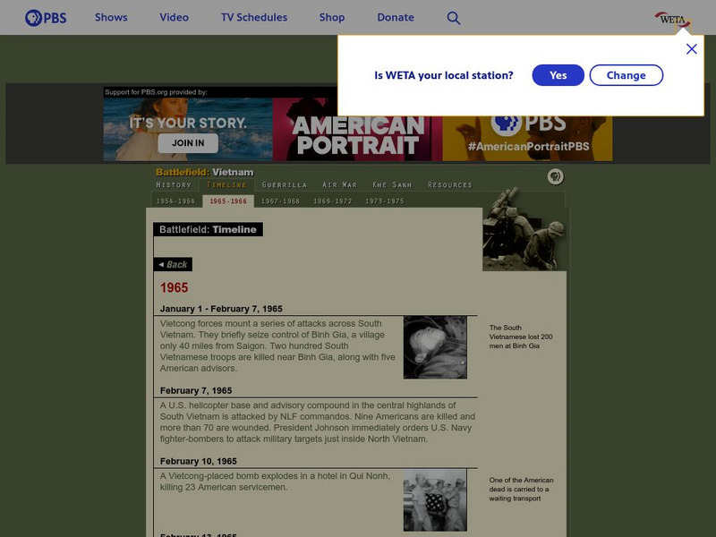 Timeline of important events affecting the battlefield during the Vietnam War from January 1, 1965, to the end of the war on April 30, 1975. You will need to click on Next at the bottom of the pages to view to the end. Click Back at the...