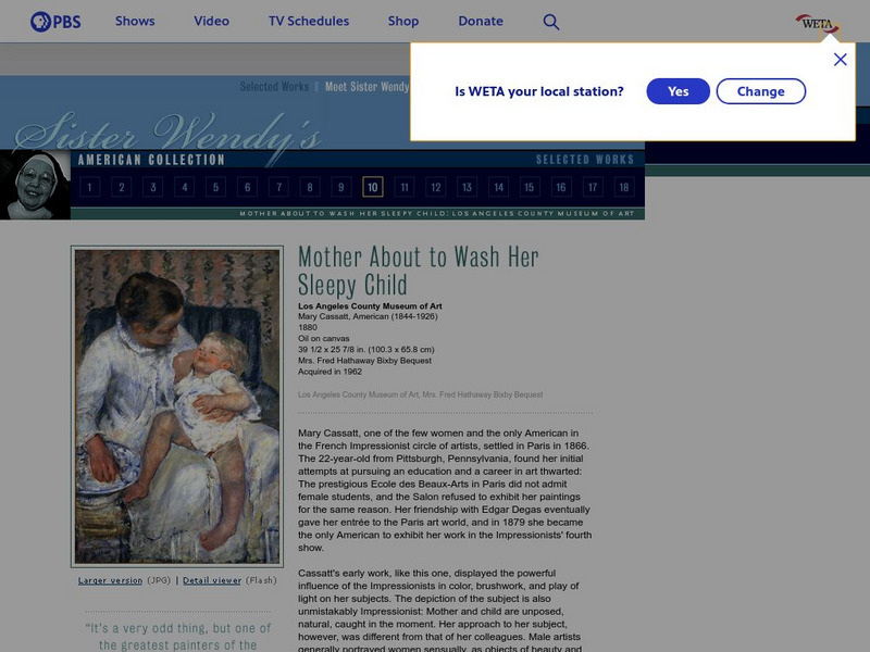 Webpage describing the painting Mother About to Wash Her Sleepy Child by Mary Cassatt from the Los Angeles County Museum of Art. Image of art provided as well as an option of a larger version or a detail viewer that can be navigated....