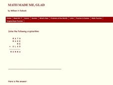 In this math puzzle, each letter stands for a number. Students find the numbers to substitute for each letter so the words "math made me glad" add up to "momma." Eight solutions are shown on the answer key.