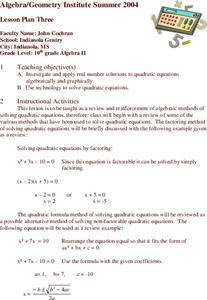 Students solve quadratic problems by factoring. Using a specified website, or an interactive CD-ROM, students graph quadratic equations. Together, on the computer, students work example problems. Students observe the link between...