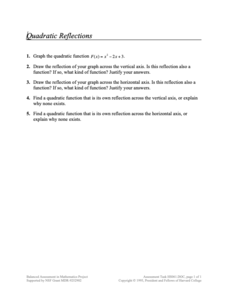 Reflect upon the graphs of quadratic functions. Given a quadratic function to graph, pupils determine whether the graph after a horizontal and vertical reflection is still a function. The final two questions ask scholars to describe a...