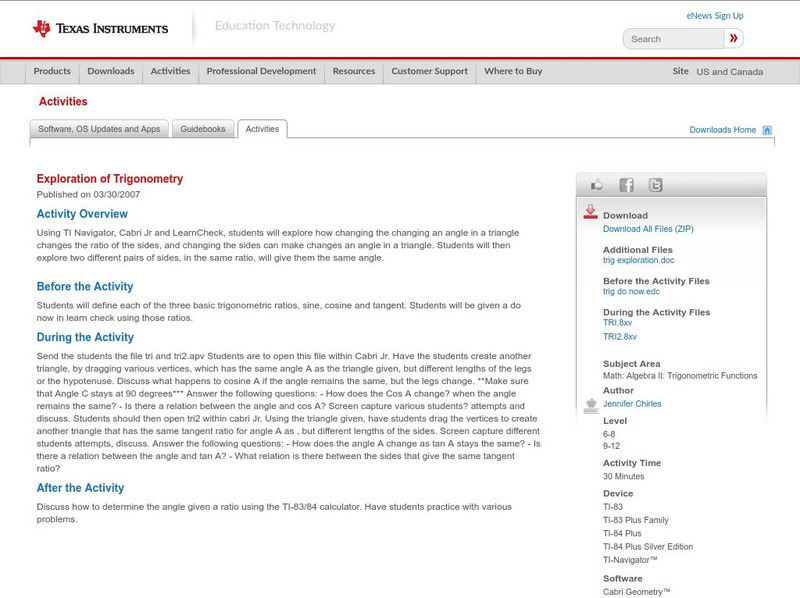 Using TI Navigator, Cabri Jr and LearnCheck, students will explore how changing an angle in a triangle changes the ratio of the sides, and changing the sides can make changes an angle in a triangle. Students will then explore two...
