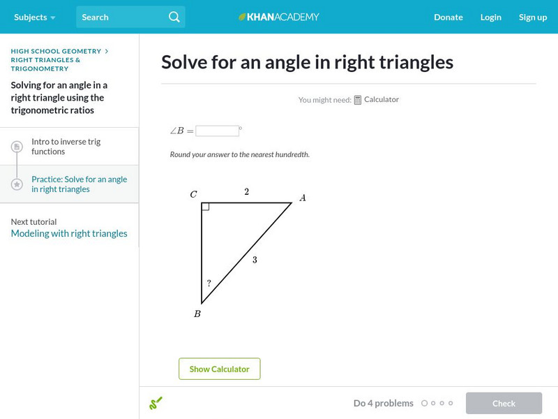 Given two sides in a right triangle, find one of the acute angles using trigonometry. Students receive immediate feedback and have the opportunity to try questions repeatedly, watch a video or receive hints.