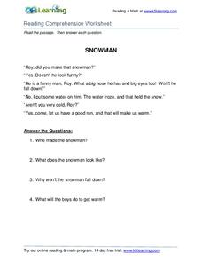 Young scholars read a brief text detailing a conversation between two children about building a snowman, then show what they know by way of four reading comprehension questions.