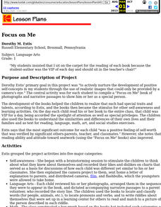 First graders create a "Focus on Me" book of photographs and narrative passages about themselves. They focus on the traits that make each of them special. They become a VIP for a day in order to share the books.