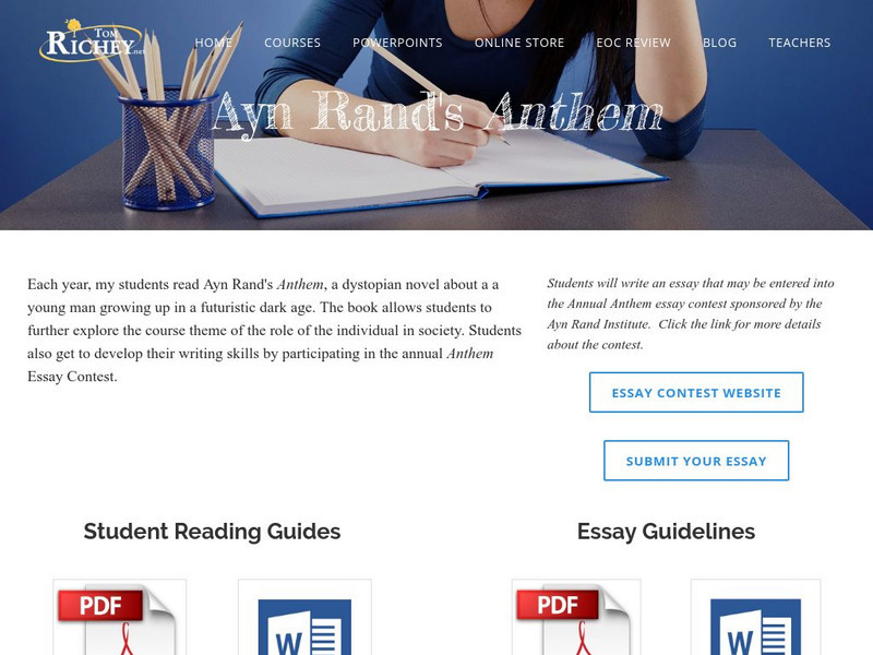 Learning unit and essay writing contest based on Ayn Rand's dystopian novella, Anthem. Includes student reading guides, essay guidelines and contest link.