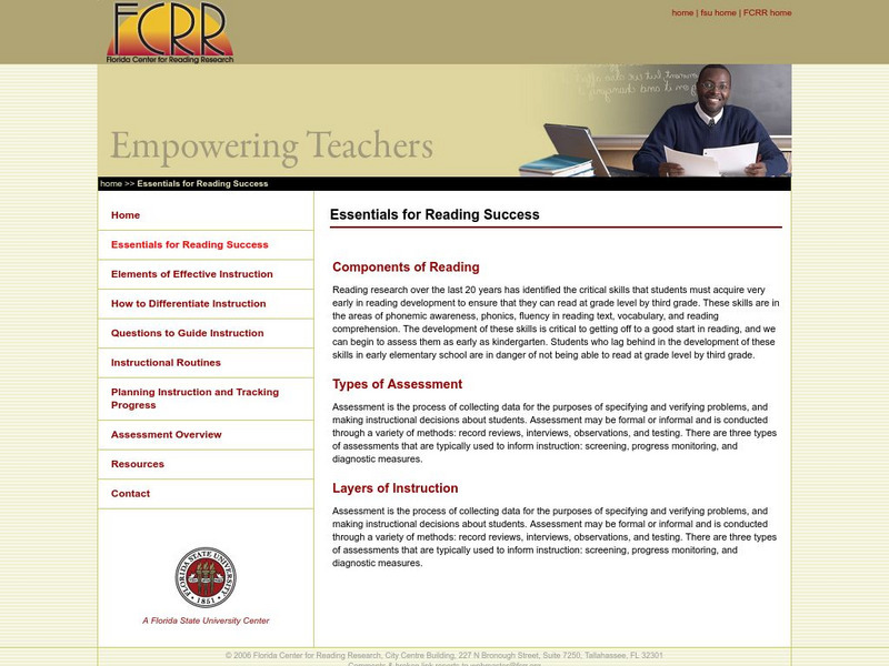 This site offers three cyclical flow charts of the essentials for reading success: components of reading, types of assessment, and layers of instruction.