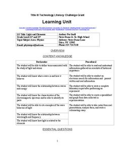Students are given a mnemonic device to review the light spectrum as it relates to the different components of refracted light. In this components of light lesson, students read Light Magic and review the properties of light. Students...