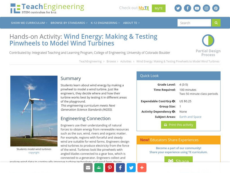 Students learn about wind energy by making a pinwheel to model a wind turbine. Just like engineers, they decide where and how their turbine works best by testing it in different areas of the playground.