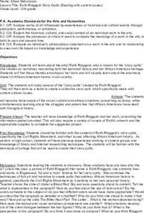 Twelfth graders examine the impact of African American culture on the United States by inspecting Faith Ringgold's story quilts. Working in groups, they create a collective story quilt about current cultural issues. They research their...