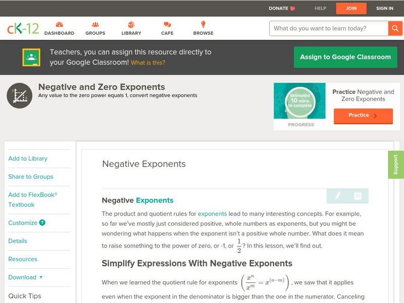 [Free Registration/Login may be required to access all resource tools.] In this lesson students simplify exponential expressions that involve negative powers. Students examine guided notes, review guided practice, watch instructional...