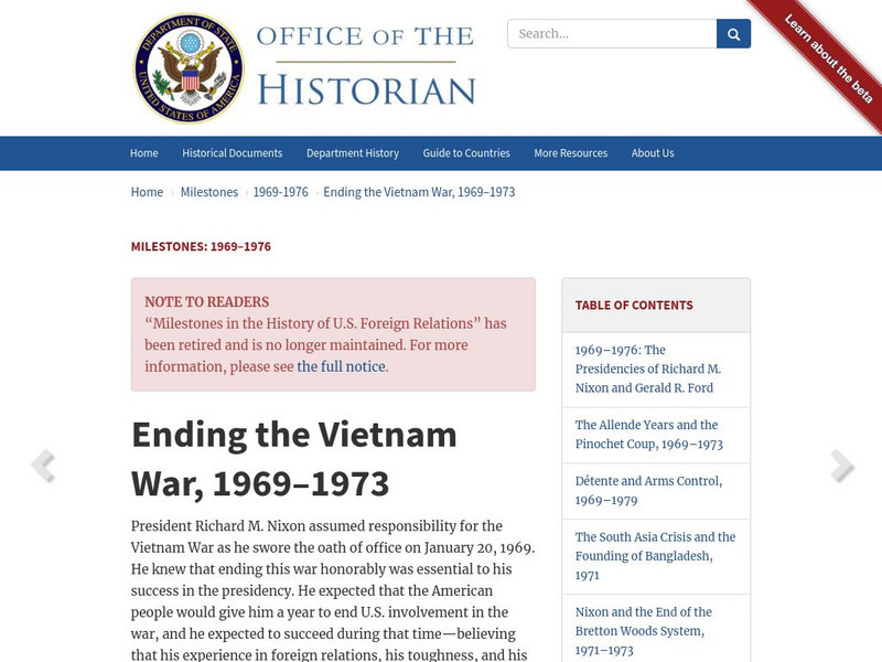 Focus on ending the Vietnam War from the beginning of the Nixon administration in 1969. Essay covers U.S. strategy, both foreign and domestic, leading to the eventual withdrawal of American troops from Vietnam.