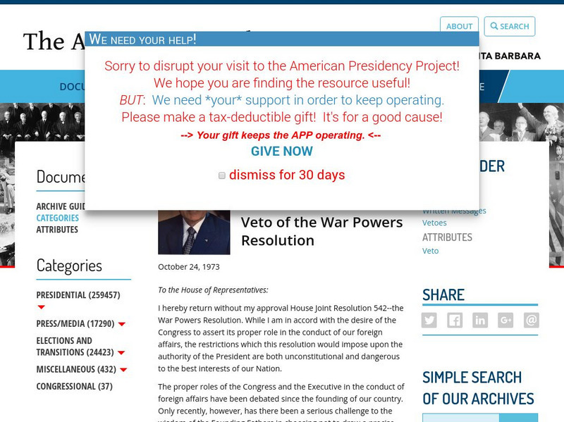 Primary source document for students and teachers. President Richard M. Nixon's letter dated October 24, 1973, vetoing the War Powers Resolution.
